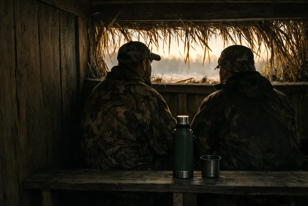 Before daylight, when the world is still more shadow than shape, men step carefully into a structure that is barely a structure at all — a frame of wood, a scatter of grass, a low roof stitched from cane and patience. Waders scrape softly. Thermoses open with a muted twist. Shotguns rest against rough boards worn smooth by years of use.