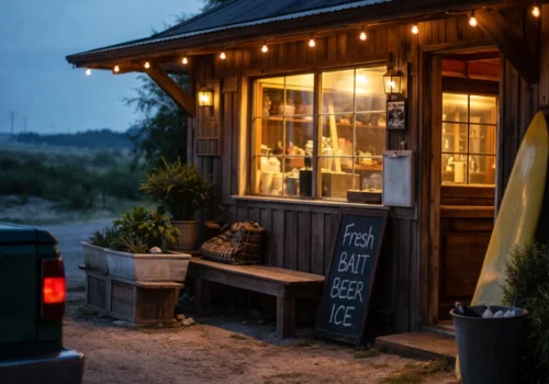 Notice the roofline. The way it leans. The way the boards breathe light.